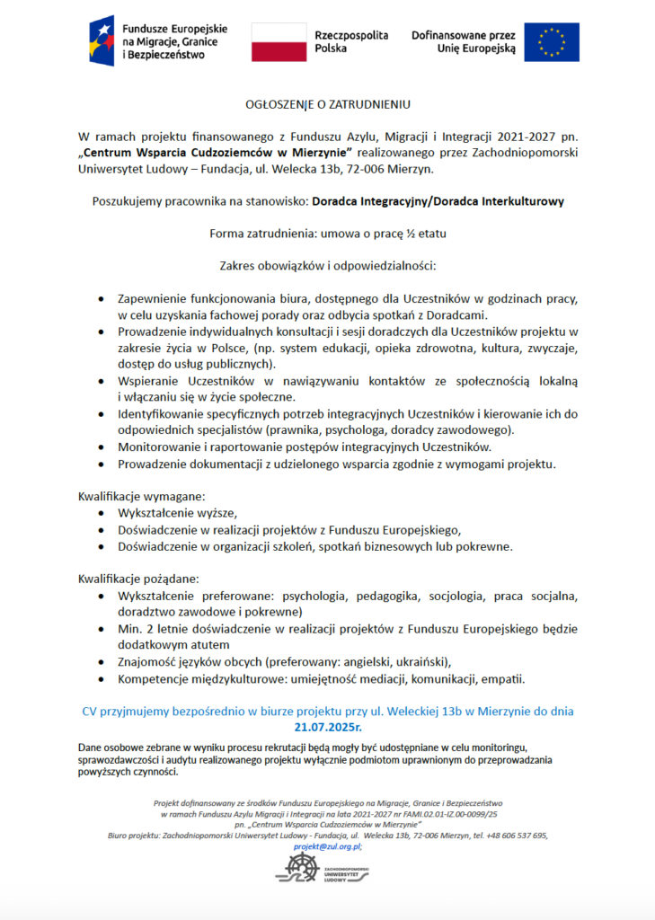 CV przyjmujemy bezpośrednio w biurze projektu przy ul. Weleckiej 13b w Mierzynie do dnia 21.07.2025r.