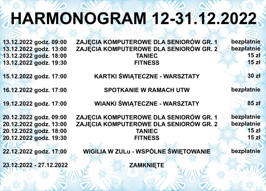 Przed nami intensywny przedświąteczny czas, więc przedstawiamy szczegółowy plan na drugą połowę grudnia.SERDECZNIE ZAPRASZAMYDO KORZYSTANIA Z ZULowych ATRAKCJI!…